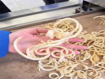 其次,豬皮的組織結構特性使其非常適合微波膨化。在微波作用下,豬皮內部的水分迅速升溫并汽化,產生大量蒸汽。這些蒸汽被膠原纖維網絡包裹,形成高壓環境。當壓力超過豬皮組織的承受極限時,就會瞬間釋放,導致豬皮膨脹并形成多孔結構。這種膨化過程是瞬間完成的,因此能夠實現連續生產。此外,微波加熱的均勻性也確保了豬皮膨化的品質一致性,避免了傳統方法中常見的局部焦糊或膨化不均的問題。