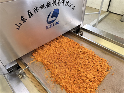 In the process of making meat floss, drying is a crucial step that must not be taken lightly. First, thoroughly stew the carefully selected meat until soft and tender, then tear it into thin shreds. Next, add seasonings and stir thoroughly to taste. Then, evenly spread these mixed shreds on the conveyor belt of the dryer. Finally, set the appropriate baking speed and microwave power according to actual needs, and the drying process officially begins.