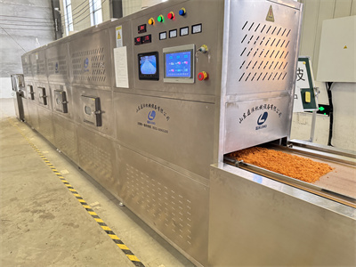 Before entering the microwave tunnel oven drying process, the feeding operation must be completed first. The staff will evenly spread the seasoned and mixed shredded meat on the conveyor belt of the tunnel furnace. During spreading, the thickness of the shredded meat will be controlled to ensure that the thickness of the shredded meat is as uniform as possible, avoiding local thickening or breakage. The conveyor belt will smoothly drive the shredded meat and slowly enter the interior of the microwave tunnel, initiating continuous drying operations.